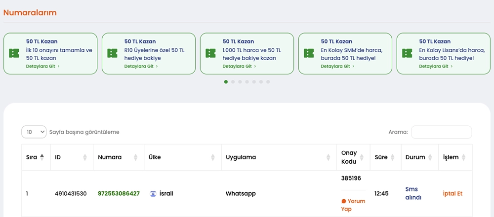 • WhatsApp, Telegram, Google, Instagram, TikTok gibi uygulamalarda SMS doğrulama