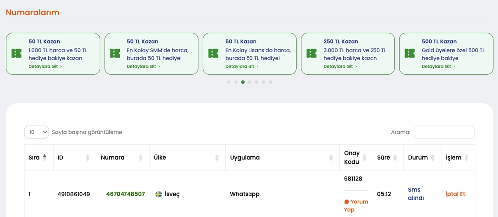 Numaranız aktif hale geldiğinde, ilgili platformdan gönderilen doğrulama mesajı birkaç saniye içinde panelinizde görünecektir.