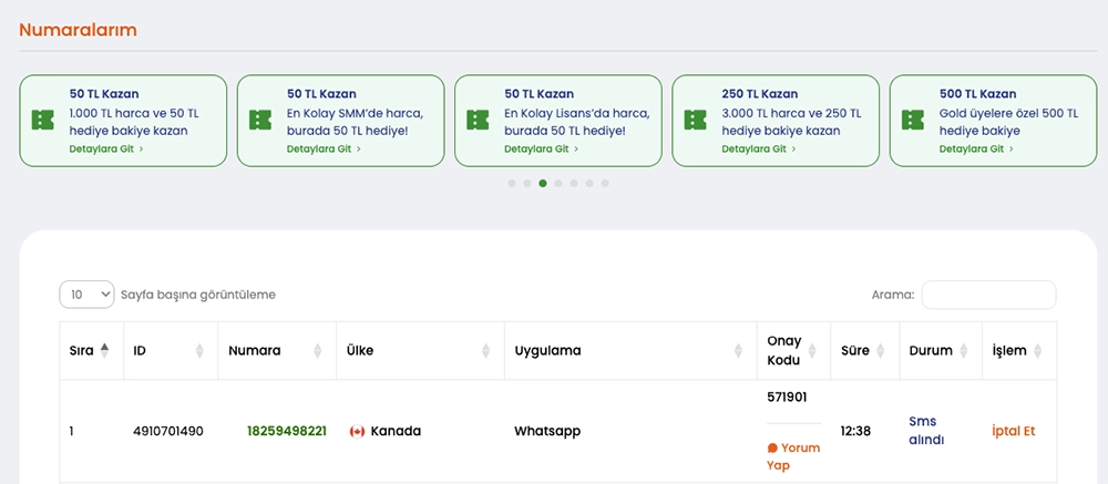 Numaranız aktif hale geldiğinde, ilgili platformdan gelen doğrulama mesajı panelinizde birkaç saniye içinde görüntülenecektir.