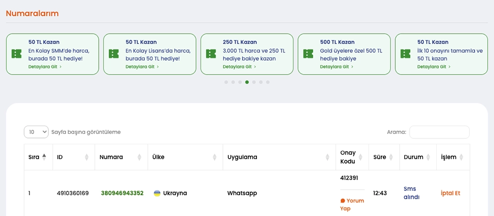 Numaranız aktif olduğunda, ilgili platformdan gelen doğrulama mesajı panelinizde birkaç saniye içinde görüntülenecektir.